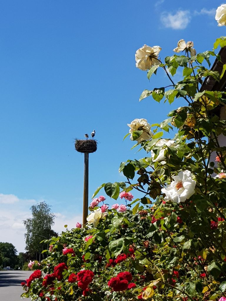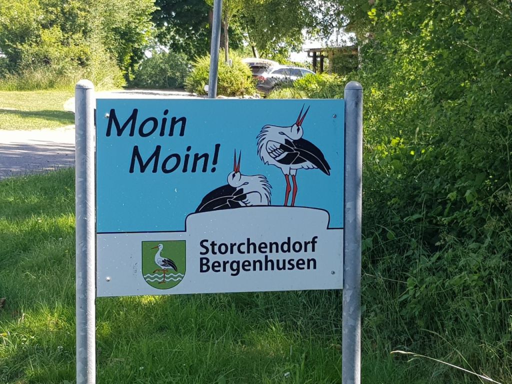 Wir fahren mit den Rädern nach Bergenhusen. Das so genannte Storchendorf. Es sind – laut NABU – bis zu 19 Storchenpaare die hier jedes Jahr ihre Jungen bekommen und aufziehen.