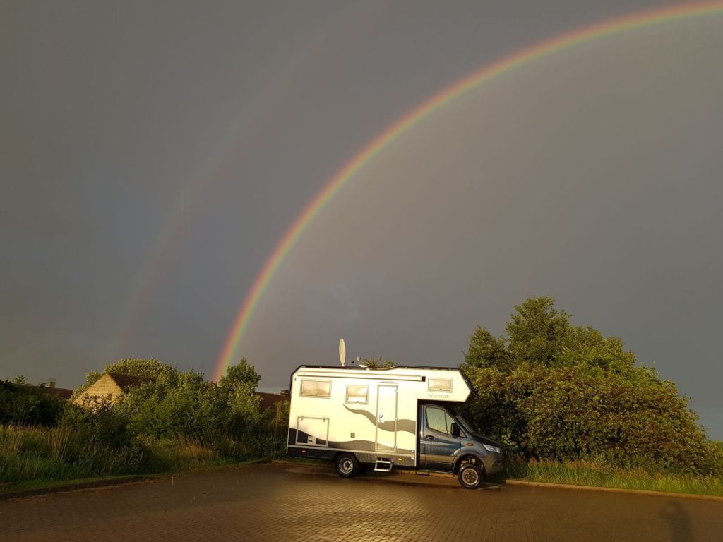Gegen Mittag fahren wir von zu Hause los. Zunächst mal mit unserem ErWin auf die Waage. Nein, er ist nicht zu schwer: 4770 kg mit allem Gepäck und Fahrer und Beifahrerin 🙂