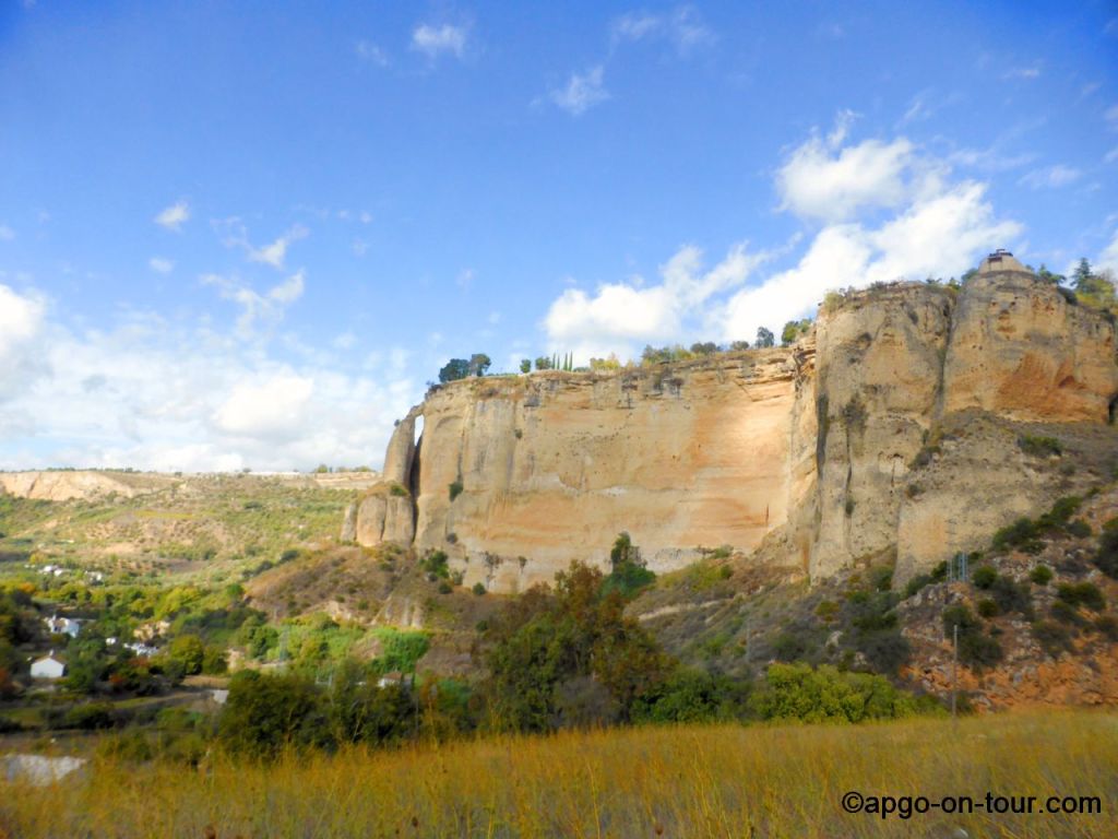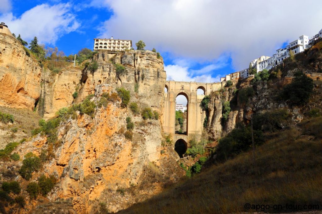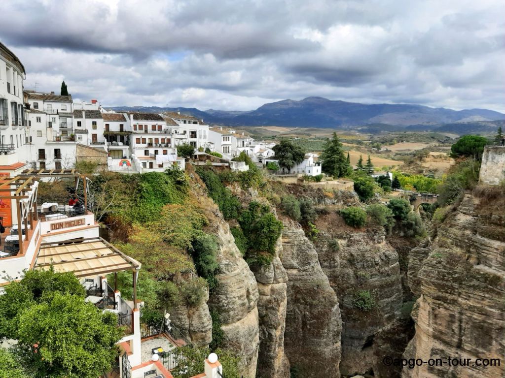 RONDA ist eine Kleinstadt auf einem Berggipfel in Andalusien, gehört zu den so genannten weißen Dörfern und besitzt eine atemberaubende Lage oberhalb einer tiefen Schlucht. Diese Schlucht (El Tajo) teilt die Neustadt, die ungefähr aus dem 15. Jahrhundert stammt, von der Altstadt aus der Zeit der maurischen Herrschaft. Diese beiden Stadtteile werden durch die bekannte Brücke PUENTE NUEVO verbunden. (soviel aus google 🙂 )