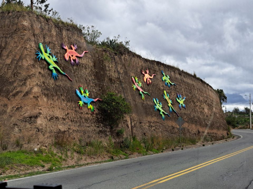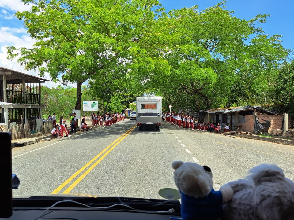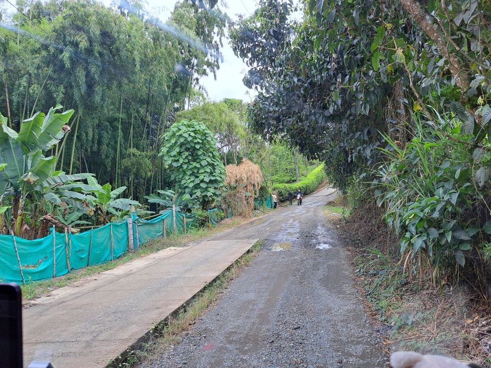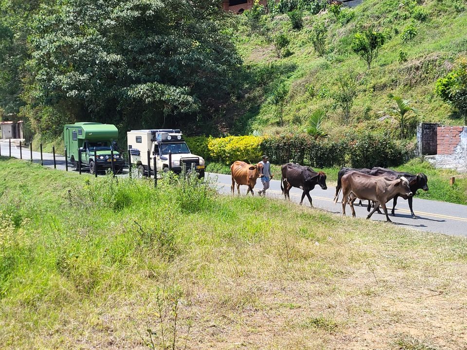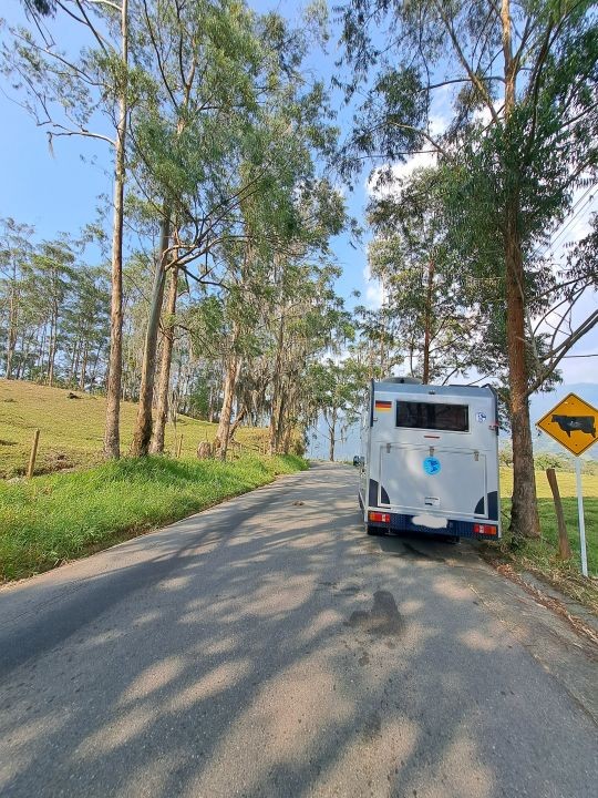 Eine lange Fahrt durch das grüne Kolumbien, bergauf, bergab, viele Kurven, enge Straßen. Wir fahren wie vom Roadbook angegeben, kommen auf Grund einiger Großbaustellen in Staus… nehmen dann aber wohl eine Ausfahrt zu früh – folgen unserem Navi. Fahren über enge, etwas zugewachsene Straßen den Berg hoch. Kommen durch kleine, enge Dörfer. Das Ganze dauert. Aber auch wir kommen irgendwann an 😊