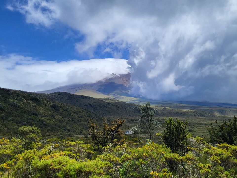 Wieder geht es zunächst runter, dann wieder rauf – in den Nationalpark COTOPAXI. Unser Übernachtungsplatz befindet sich auf einer Höhe von gut 3800 Meter üNN mit sehr schönem Blick auf den 5897 Meter hohen Vulkan COTOPAXI.