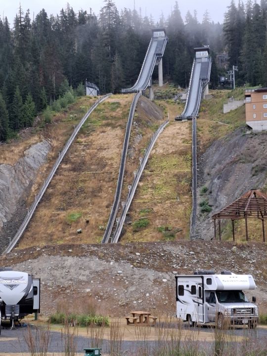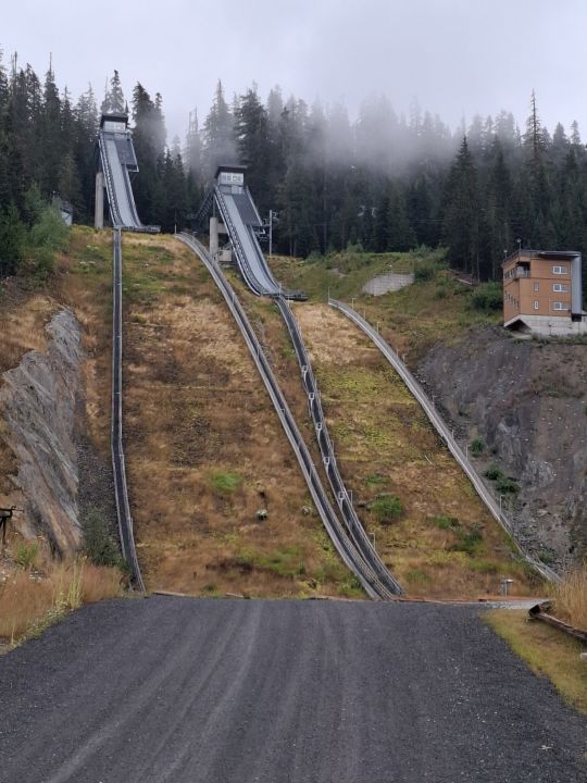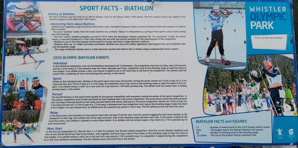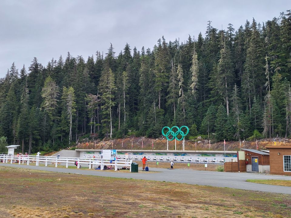 Wir fuhren also zunächst zum WHISTLER Olympic Parc. Hier fanden die Langlauf, Biathlon und Skisprung. Wieder einmal fanden wir eine Skistätte ohne Schnee – naja, um diese Jahreszeit war das wohl auch nicht zu erwarten. Aber immerhin waren ein paar Biathleten auf Rollerski unterwegs.