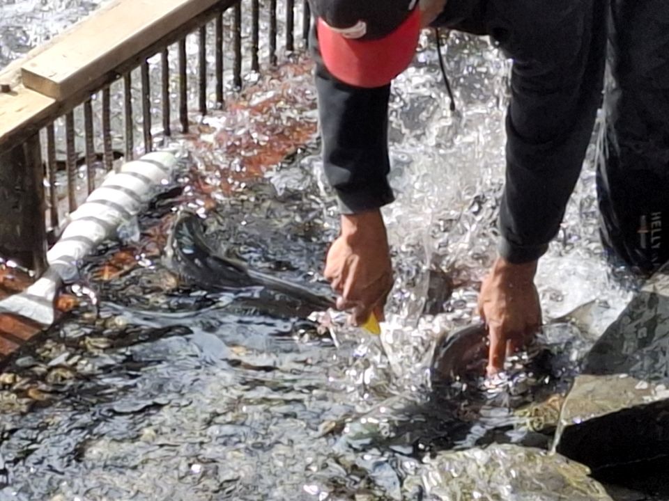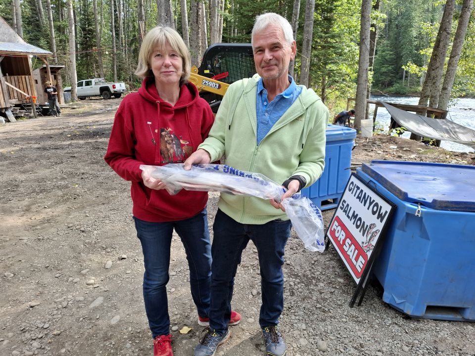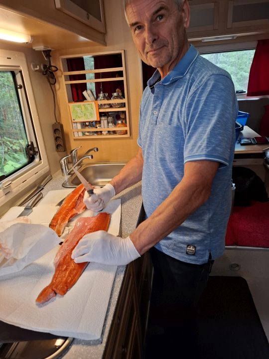 Im Bereich des Meziadin Lake finden wir die Zufahrt zu einem Fluß auf dem die Lachse „wandern“. Wir kaufen einen ca. 3 bis 4 kg schweren extra für uns gefangenen Lachs der dankenswerter Weise auch noch ausgenommen wird 🙂 Portionieren müssen wir ihn selbst. Das klappt auch ganz gut.