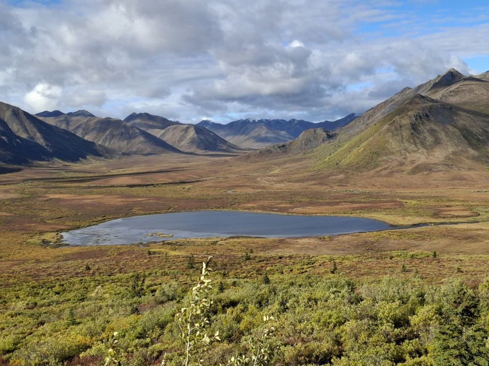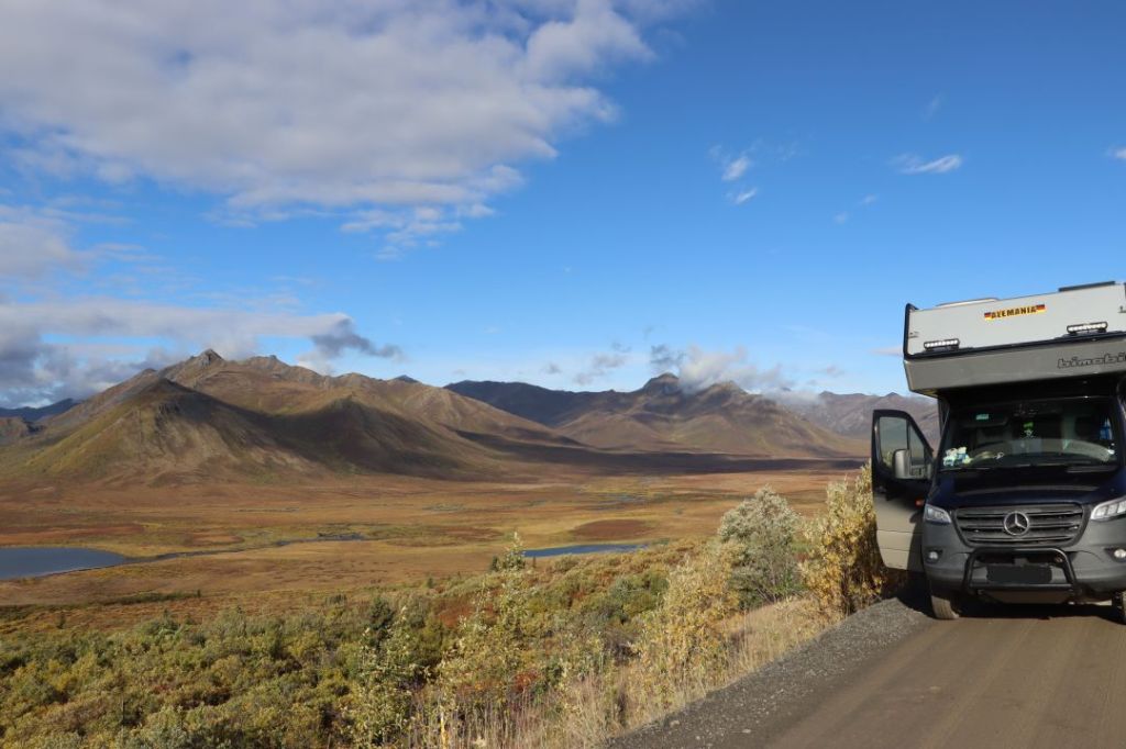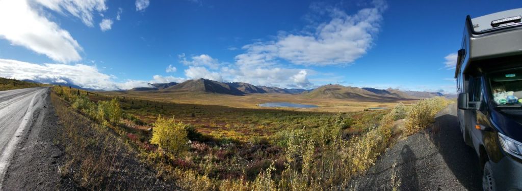 Nach einer Übernachtung auf dem dortigen Campground fahen wir am anderen Morgen noch bis zum höchsten Punkt des Dempster Highway – ca. 1300 Meter über NN. Der Niederschlag der letzten Nacht ist auf den umliegenden Bergen als Schnee liegen geblieben.