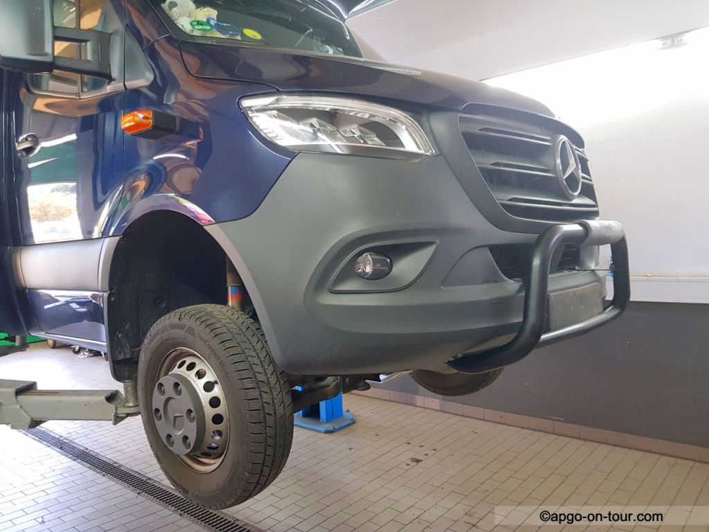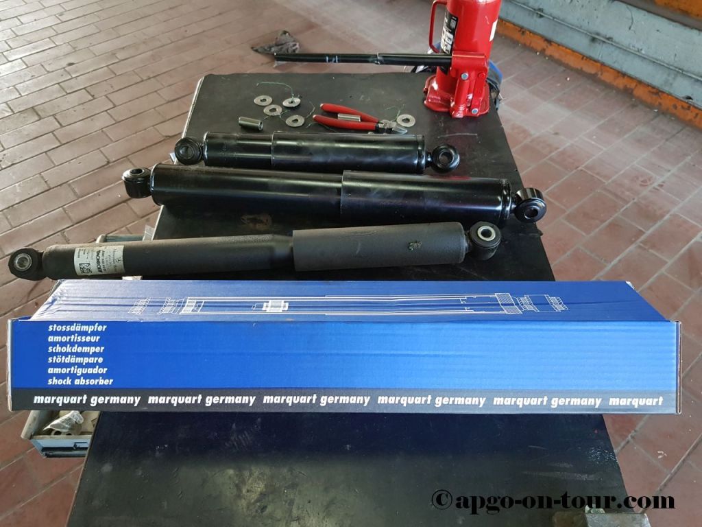 August 2020 – ein kompletter Satz neuer Stoßdämpfer – Fa. Marquardt (www.marquartstossdaempfer.de) – wurde von der Fa. Baro in 49624 Löningen eingebaut. Mit den serienmäßig verbauten Mercedes Stoßdämpfern schaukelte der Sprinter mit der hohen Bimobilkabine schon ziemlich auf und ist auch bei Seitenwind „etwas“ empfindlich. Nach Einbau der Marquardt Stoßdämpfer hat sich dieses Fahrverhalten wesentlich gebessert. ErWin fährt seitdem „wie auf Schienen“