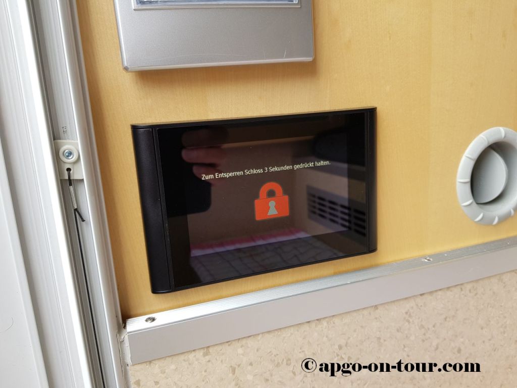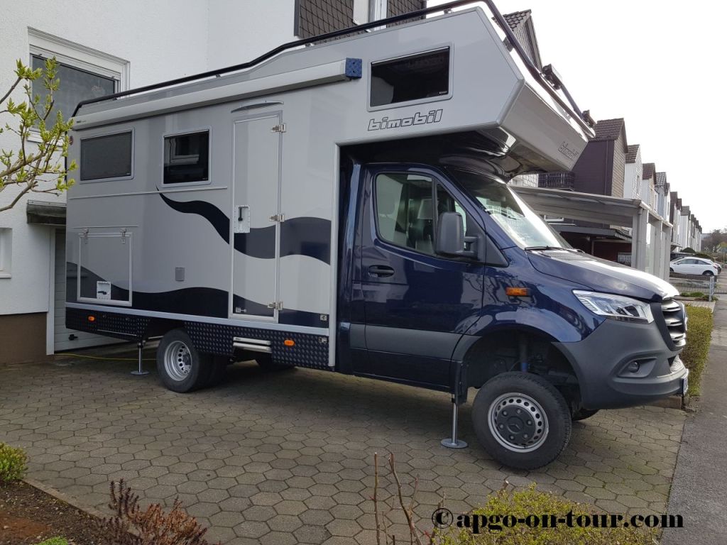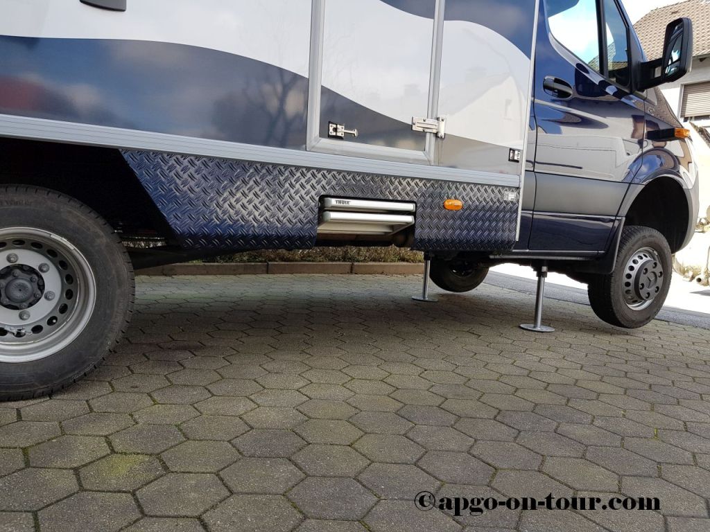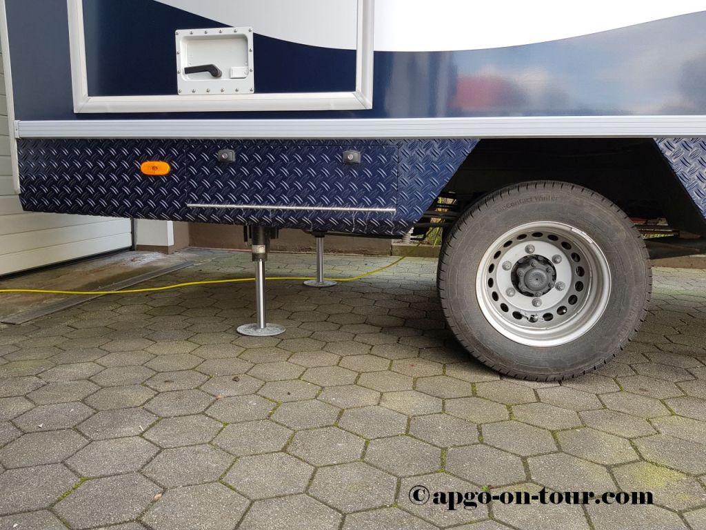 November 2020 – durch die Fa. Klecamp, 47559 Kranenburg, (www.klecamp.de/start.html) wurden hydraulische Hubstützen eingebaut. Das System kann über ein im Aufbau verbautes Display oder auch mit einer Smartphone-App betrieben werden. Das Fahrzeug steht in relativ kurzer Zeit „pillegerade“ und schaukelt kein Stück mehr. Es gibt noch weitere Einstellungsmöglichkeiten, z.B. um das Brauchwasser besser ablaufen zu lassen etc. Für den Fall der Fälle – z.B. einem Reifenwechsel, Anlegen von Schneeketten – läßt sich das Fahrzeug vorne komplett bis zum Abheben der Vorderräder anheben. Hinten werden dazu zwar noch ein paar „Klötzchen“ benötigt, dass dürfte aber mögliche Arbeiten erheblich erleichtern.